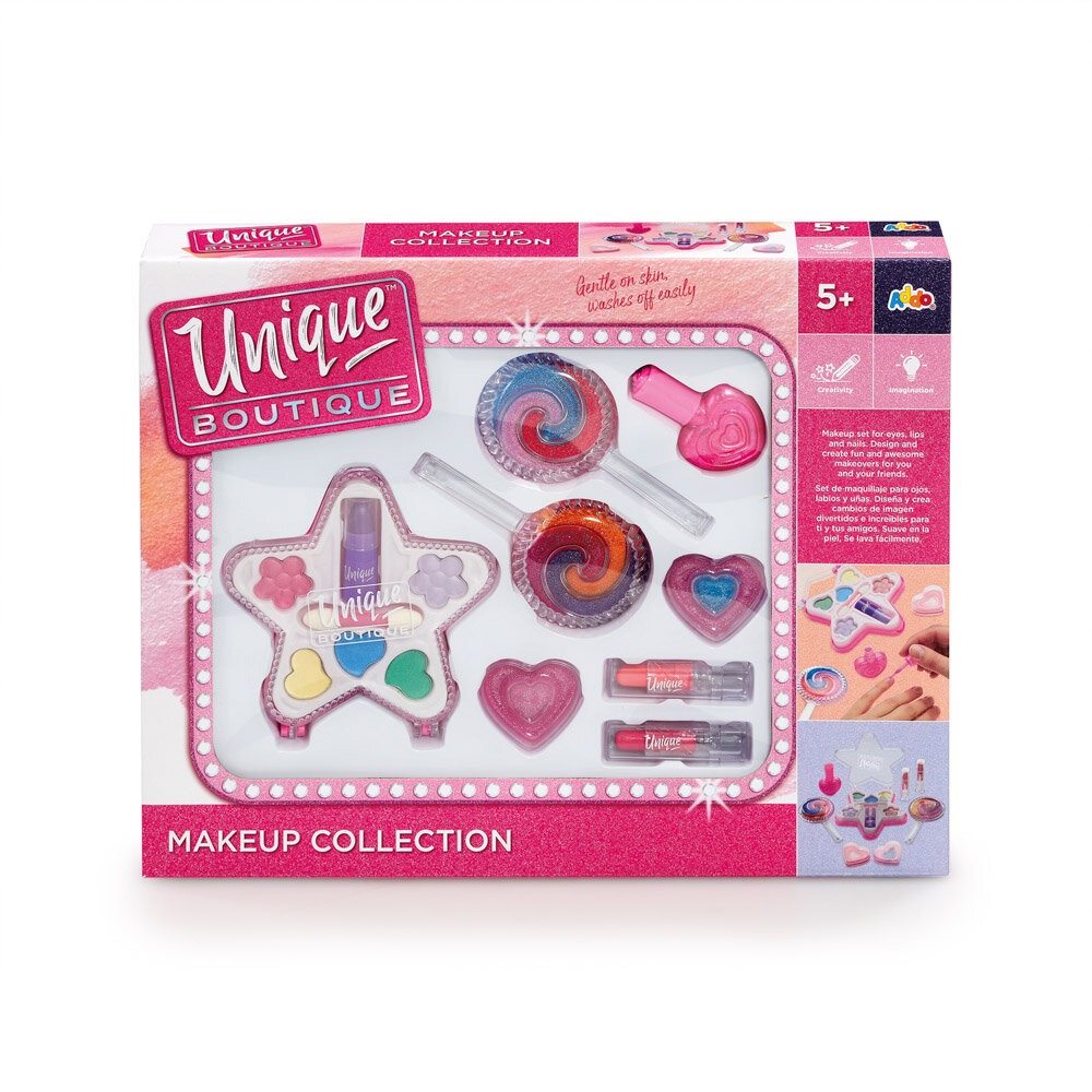 V sade nájdete všetko, čo potrebujete. Lak na nechty v tvare srdca. Roztomilé puzdro na make-up v tvare hviezdy, rúž a päť jasných očných tieňov. Produkty sú šetrné k pokožke a ľahko sa zmývajú.