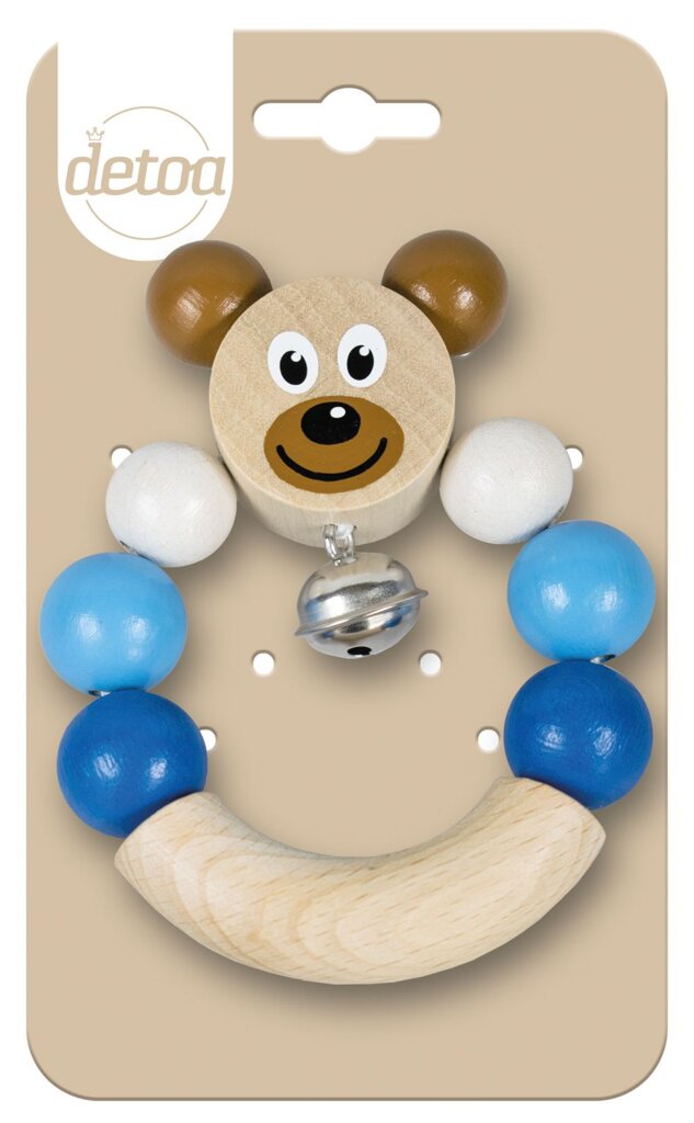 Drevená hrkálka s medvedíkom v modrej farbe.