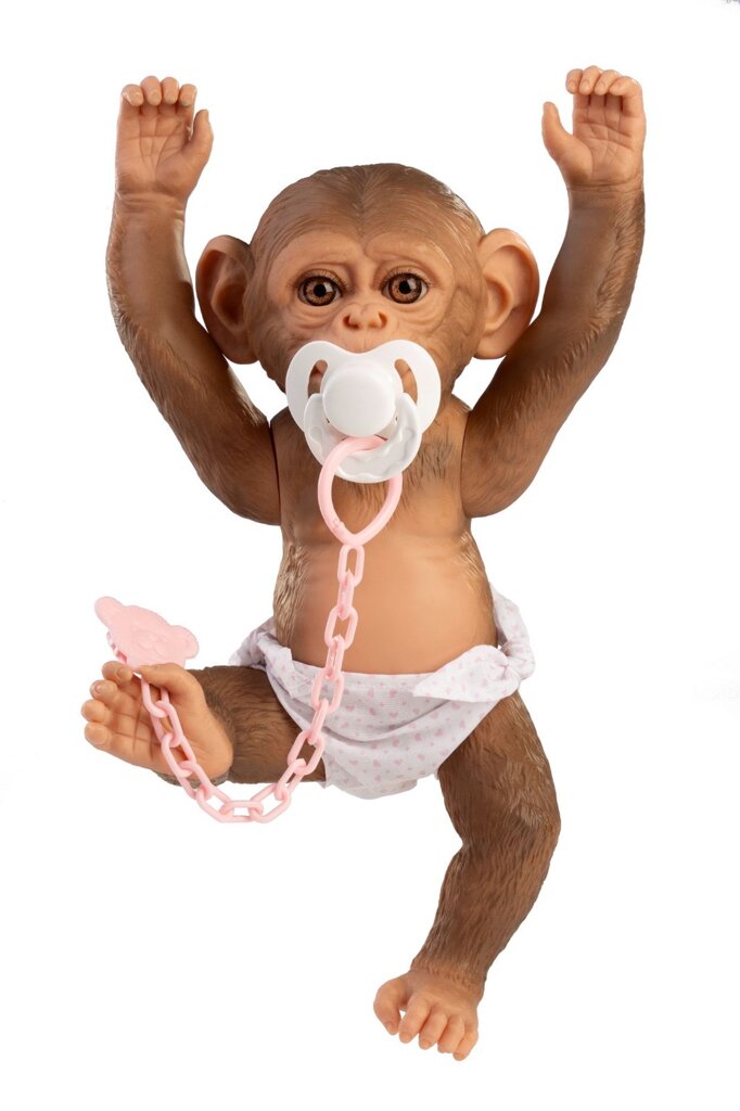 Veselé a roztomilé opičie bábätko bez zvuku s vinylovým telom s možnosťou kúpania, na ktorom je zachytený vierohodne každý detail tohto zvieracieho mláďatká vrátane rôznych záhybov, okrem pohlavia.