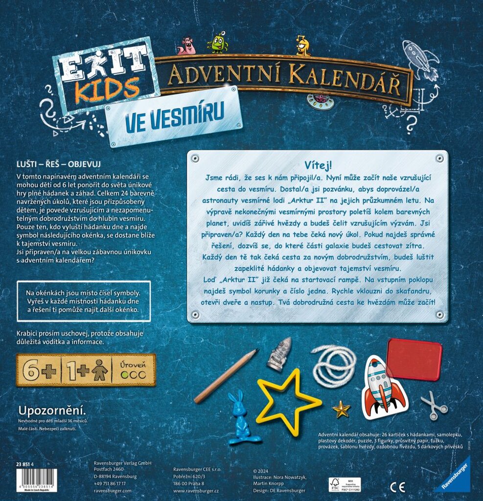 Tešíš sa na dobrodružstvo? S EXIT Kids adventným kalendárom Vesmír ťa čaká množstvo napätia podobne ako v únikovej miestnosti. Dostal/a si pozvánku, aby si sprevádzal/a astronautov vesmírnej lode „Arktur II” na ich prieskumnom lete. Na výprave nekonečnými vesmírnymi priestormi poletíš okolo farebných planét, uvidíš žiarivé hviezdy a budeš čeliť vzrušujúcim výzvam. V ďalekých hlbinách vesmíru na teba čaká 24 tajomných miestností. Vyrieš ukryté hádanky, hlavolamy, skladačky a množstvo ďalších rozmanitých úloh a zisti tak, do ktorej časti galaxie budeš cestovať zajtra.