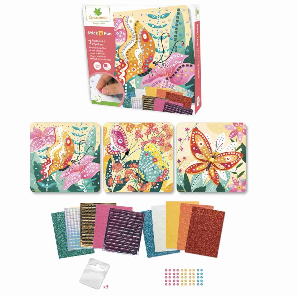 Deti si dotvoria tri obrázky farebných motýľov pomocou samolepiacich kamienkov a trblietavých mozaikových dielikov. Každý detail dodá ich výtvoru jedinečný lesk a po dokončení si deti môžu svoje diela hrdo vystaviť - stačí ich zavesiť na priložené priehľadné závesy.